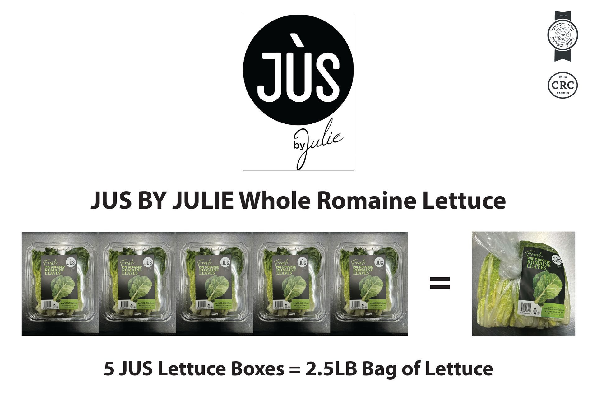 Jus by Julie, 2.5 pounds of checked romaine Passover lettuce. "For best storage results, place in a container with a paper towel to help keep it fresh!"